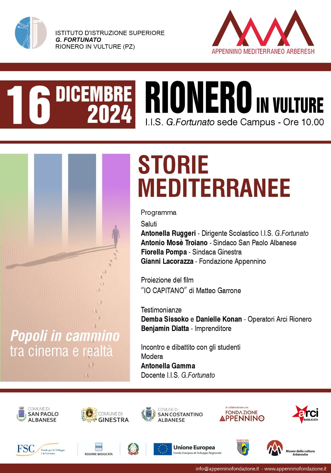 Il campus dell’Istituto di Istruzione Superiore “G.Fortunato” sarà così teatro dello stesso format già sperimentato a Senise, dal titolo “Storie Mediterranee. Popoli in cammino tra cinema e realtà” e vedrà la proiezione del film “Io Capitano” di Matteo Garrone e un dibattito con testimonianze di migranti oggi integrati nelle comunità locali. Il programma della mattinata, con inizio alle 10.00, prevede i saluti della dirigente scolastica Antonella Ruggeri, del sindaco di san Paolo Albanese, Antonio Mosè Triano, della sindaca di Ginestra, Fiorella Pompa e di Gianni Lacorazza di Fondazione Appennino.
