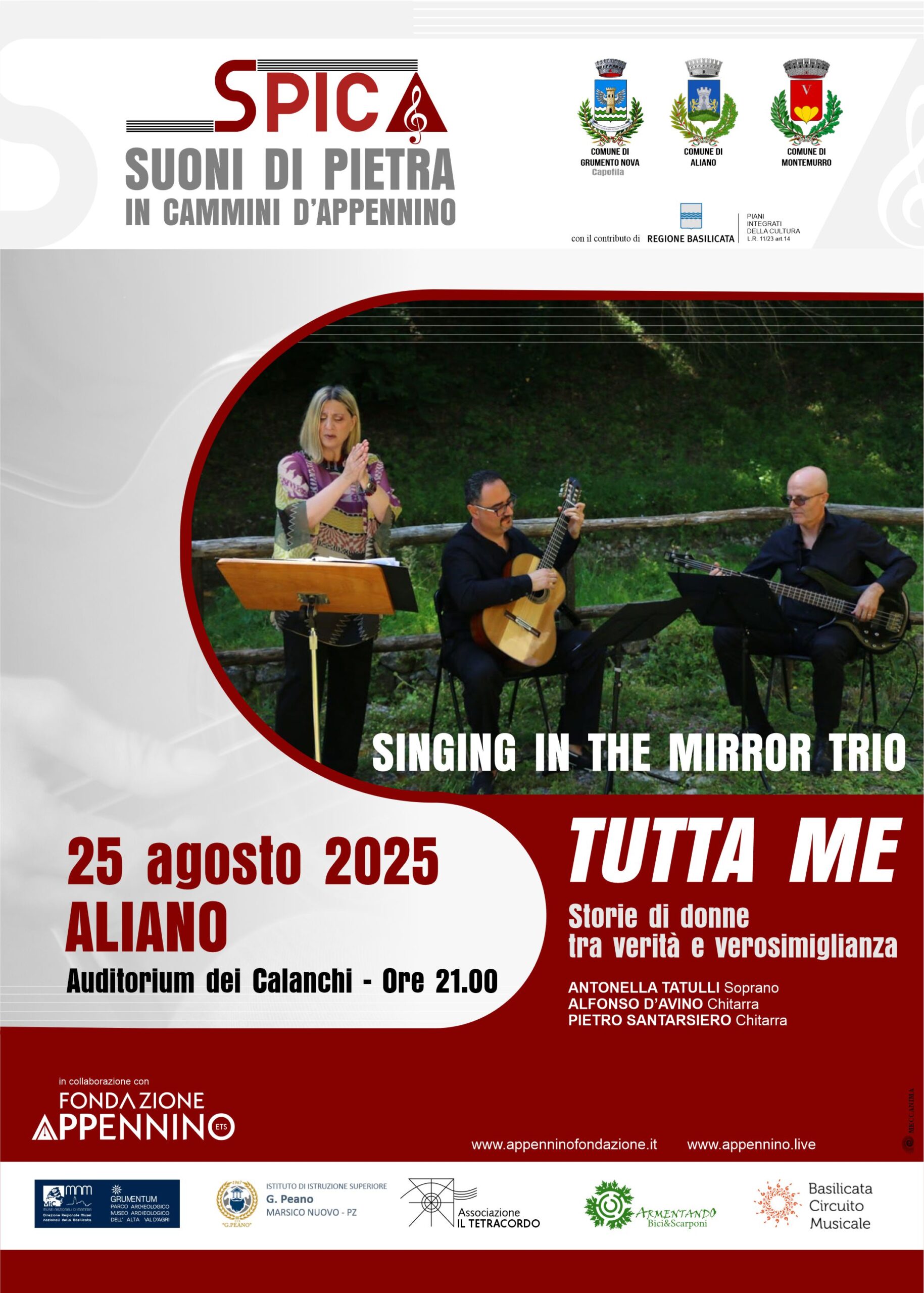 Il 25 agosto sarà poi Aliano ad ospitare il Singing in the mirror trio, composto dalla soprano Antonella Tatulli e dai chitarristi Alfonso D’Avino e Pietro Santarsiero. Lo spettacolo ha il titolo “Tutta me. Storie di donne tra verità e verosimiglianza” e si terrà nell’auditorium dei Calanchi alle ore 21.