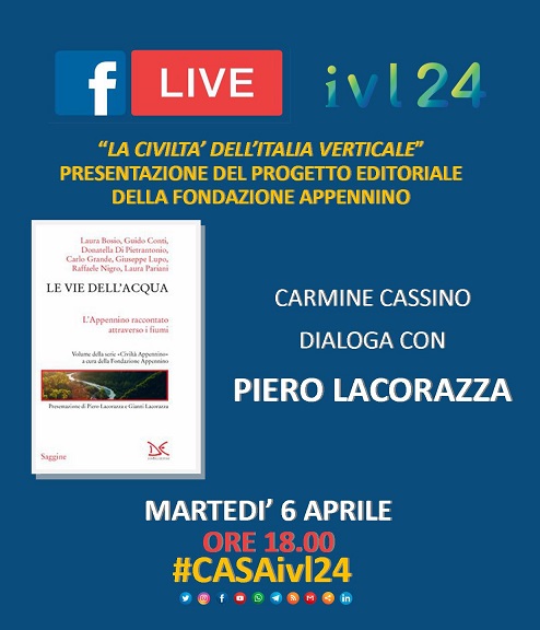 Si terrà online sulla pagina Facebook del magazine ivl24, la presentazione del progetto editoriale di Fondazione Appennino, in un incontro dal titolo “La civiltà dell’Italia verticale” in cui Carmine Cassino dialoga con Piero Lacorazza, direttore della Fondazione che racconterà la genesi del progetto nato in collaborazione con gli scrittori Giuseppe Lupo e Raffaele Nigro e con la casa editrice Donzelli, che ha già portato alla pubblicazione delle due prime saggine “Civiltà Appennino. L’Italia in verticale tra identità e rappresentazioni” e “Le vie dell’acqua. L’Appennino raccontato attraverso i fiumi”.