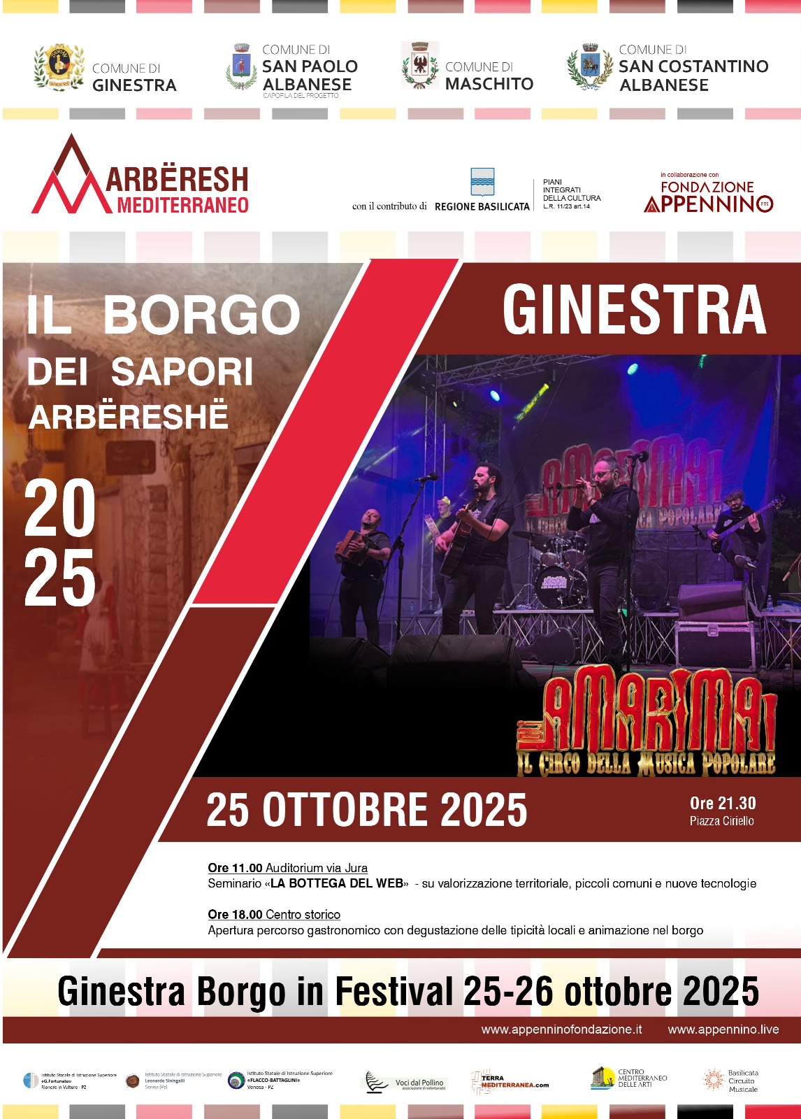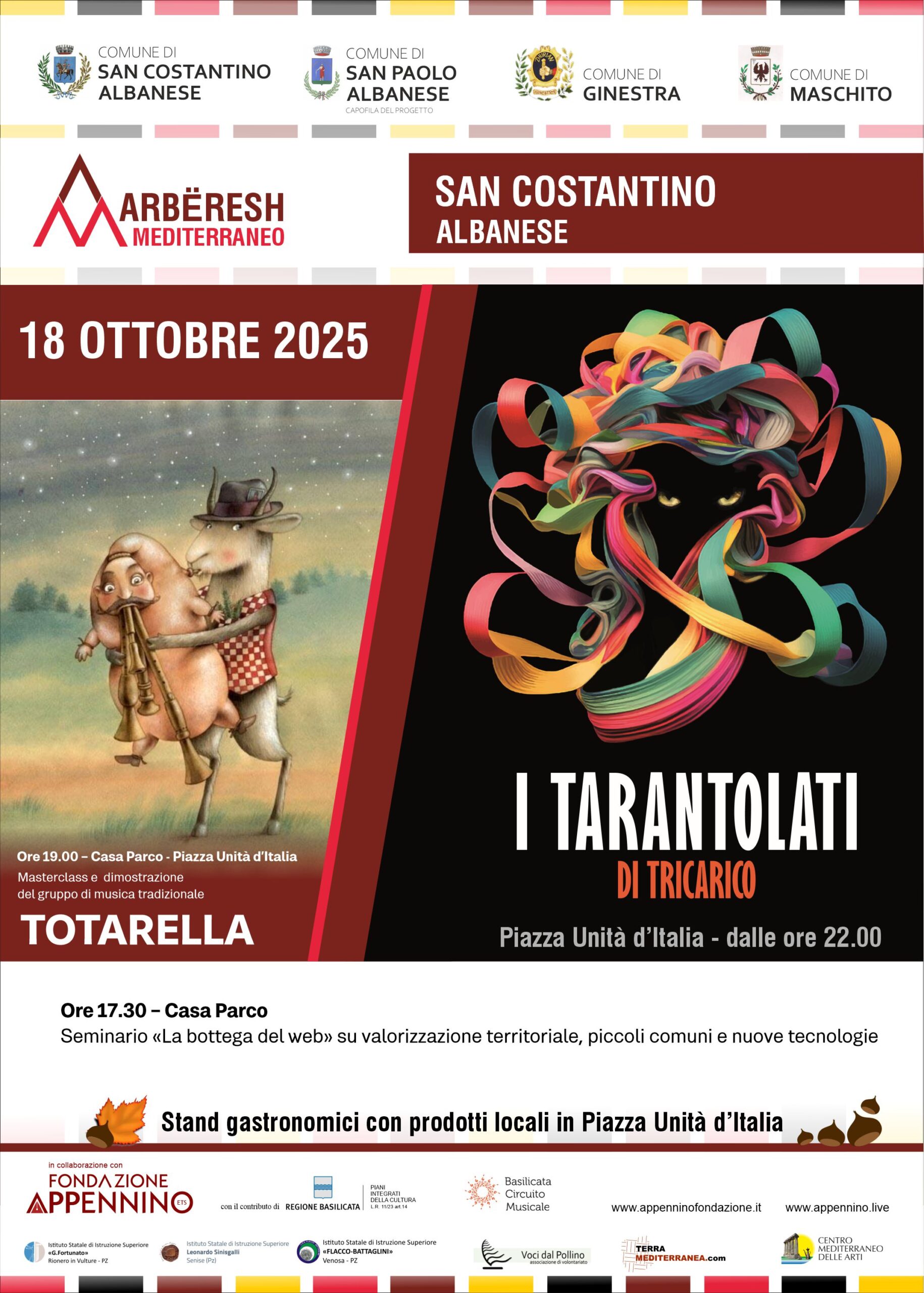 In questo quadro si inserisce il prossimo weekend che vede protagonisti i due comuni del Vulture, Ginestra e Maschito, a partire dal primo dei due comuni che domani, sabato 25 ottobre, avvia due giorni di festa Arbëreshe nel borgo. Gli appuntamenti del progetto “Arbёresh Mediterraneo” saranno dunque alle ore 11 all’auditorium in Via Jura, con un seminario formativo “La bottega del web”, su valorizzazione e marketing territoriale, piccoli comuni e nuove tecnologie rientrante nel ciclo di appuntamenti aperti alle comunità curati dalla Fondazione Appennino nei quattro comuni partner e nelle scuole. A seguire, alle ore 21.30, in piazza Ciriello, il concerto degli Amarimai chiuderà la giornata di festa della comunità, caratterizzata anche dalla presenza di stand della gastronomia locale prodotti di stagione, animazione e musica nel borgo.
