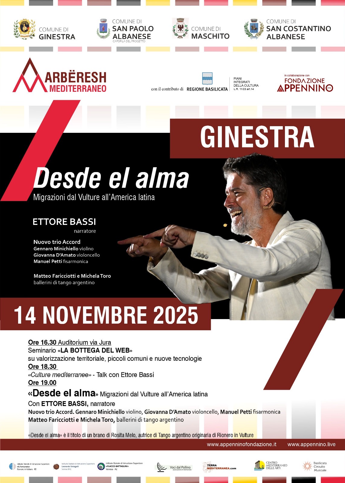 Nel primo caso, il programma della giornata prevede l’avvio alle ore 16.30 nell’auditorium di via Jura con il seminario formativo “La bottega del web”, che si concluderà con il talk con Ettore Bassi, dal titolo “Culture mediterranee”. A seguire l’attore sarà protagonista in qualità di narratore dello spettacolo dal vivo dal titolo “Desde el alma”, dedicato al tango argentino ed alle migrazioni dal Vulture all’America Latina. “Desde el alma”, che dà il titolo allo spettacolo, è un brano di Rosita Melo, autrice di tango argentino originaria di Rionero in Vulture. Sul palco anche il Nuovo Trio Accord (Gennaro Minichiello al violino, Giovanna D’Amato al violoncello e Manuel Petti alla fisarmonica), e i ballerini Matteo Faricciotti e Michela Toro.