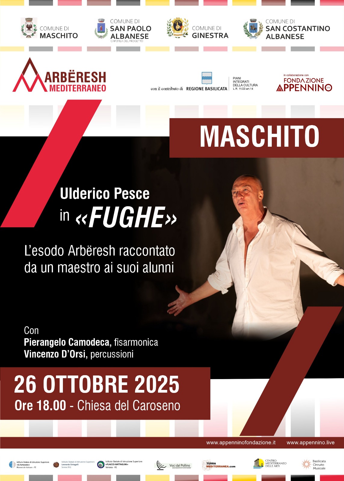 Domenica 26 ottobre sarà poi la volta di Maschito. In scena sarà Ulderico Pesce con una prima dello spettacolo “Fughe. L’esodo Arbëresh raccontato da un maestro ai suoi alunni”. L’attore lucano sarà accompagnato dalla fisarmonica di Pierangelo Camodeca e dalle percussioni di Vincenzo D’Orsi. L’appuntamento è alle ore 18.00 nella Chiesa del Caroseno.