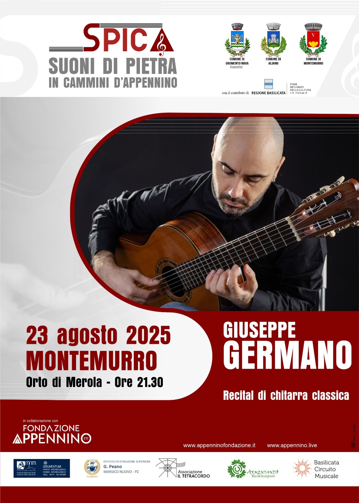 Avviato alla fine di giugno, il programma è ampio ed articolato e durerà fino al prossimo autunno con concerti nei tre comuni partner, distribuiti e organizzati da Basilicata Circuito Musicale in collaborazione con “Il Tetracordo”, una summer school a Montemurro destinata a giovani artisti e musicisti suddivisa in laboratori con masterclass musicali e ore di formazione su event management, marketing e comunicazione. Dopo la prima fase, nella quale si sono tenuti tre laboratori della summer school, masterclass, performance degli allievi e concerti di artisti affermati a Montemurro, Armento, Grumento Nova e Aliano, i due prossimi eventi vedranno come protagonista la chitarra, in due spettacoli che ospiteranno artisti virtuosi dello strumento. A Montemurro, il 23 agosto, si esibirà Giuseppe Germano in un recital di chitarra classica. L’appuntamento è previsto alle 21.30 nell’Orto di Merola, luogo nel quale si terrà l’edizione 2025 della Scuola del Graffito Polistrato, che in quell’occasione apre le sue attività.