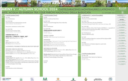 Parte il 3 ottobre fino al 6 ottobre l'Autumn School: "Arte, acqua ed energia tra i due Parchi Nazionali della Basilicata" del Master Arint di II livello "Architettura e progetto per le aree interne e i piccoli paesi" dell'Università Federico II di Napoli, Diarc del quale la Fondazione Appennino è Partner del consiglio scientifico.