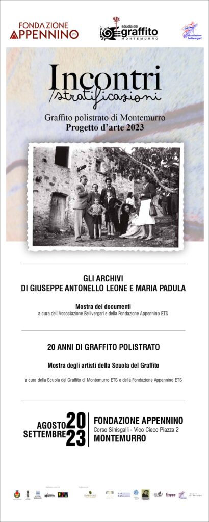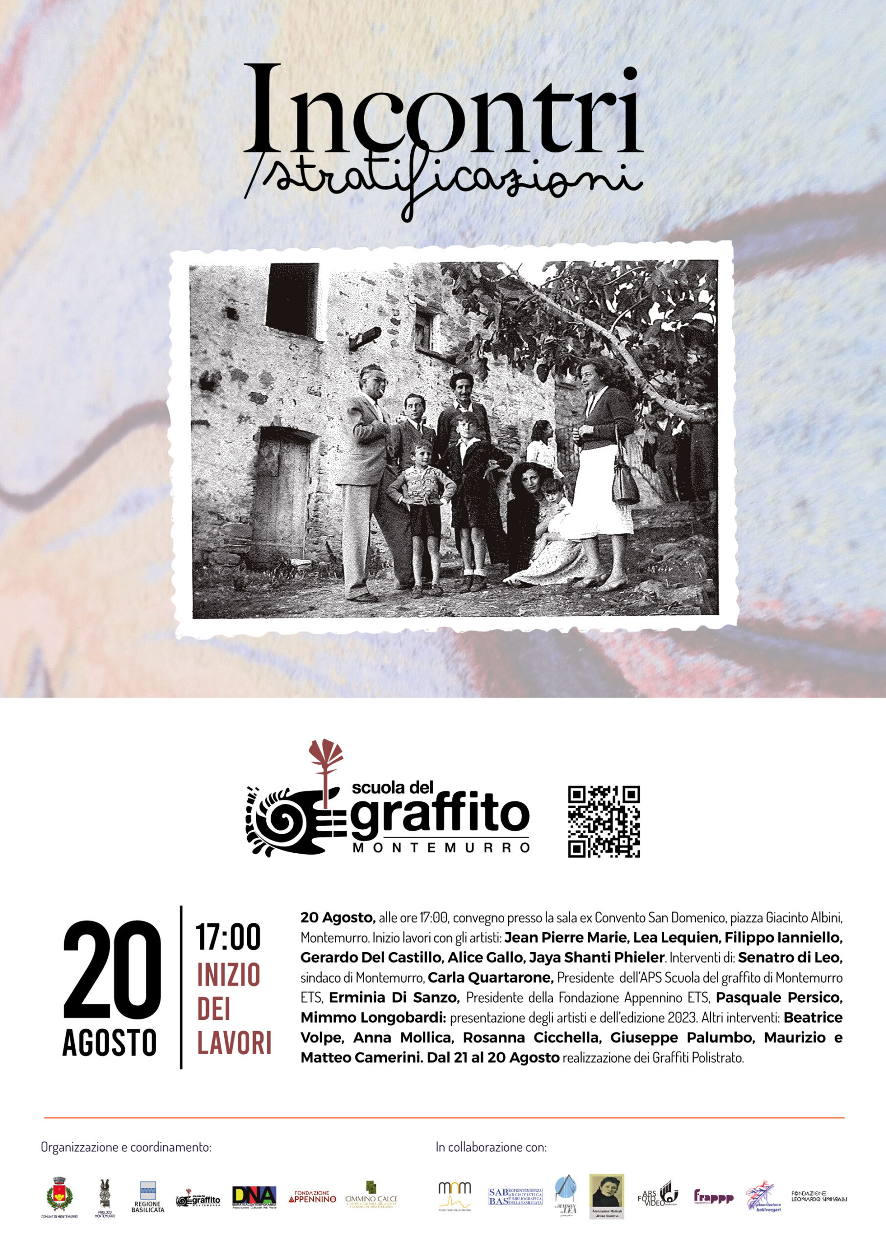 Dal 20 al 26 agosto 2023 l’APS Scuola del Graffito di Montemurro ETS in collaborazione con il comune di Montemurro organizza la tredicesima Edizione della scuola estiva del graffito polistrato con il titolo INCONTRI/STRATIFICAZIONI, un festival dell’arte e della cultura con eventi, spettacoli e seminari che faranno da cornice al tradizionale laboratorio artistico per la realizzazione delle opere con la tecnica del graffito polistrato che andranno ad arricchire il centro abitato di Montemurro, che oggi conta oltre ottanta opere realizzate negli anni.