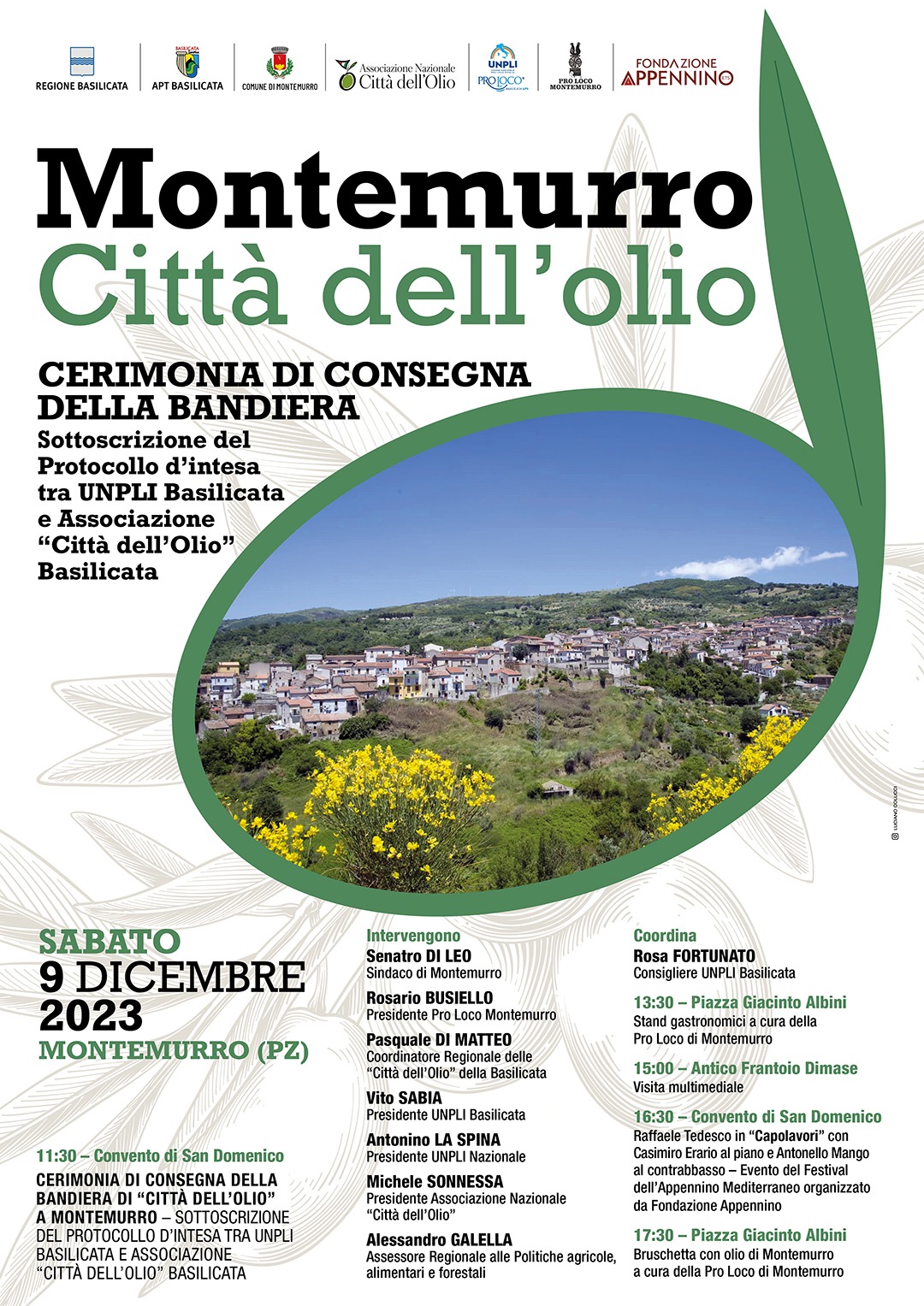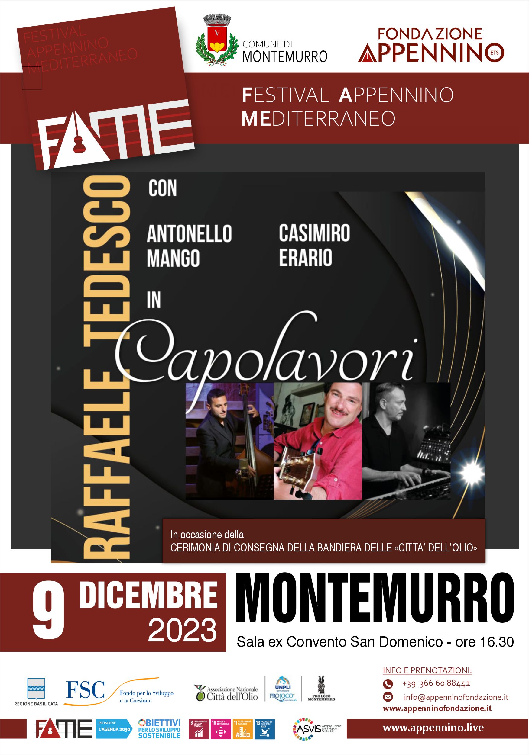 Per sostenere l’ingresso del Comune di Montemurro tra le Città dell’Olio, in virtù della storica tradizione olivicola locale e del prodotto che ha ottenuto il marchio IGP, la Fondazione Appennino il 9 dicembre 2023 offrirà alla comunità il concerto “Capolavori”; un omaggio ai grandi della musica italiana portato in scena da Raffaele Tedesco, accompagnato da Antonello Mango e Casimiro Erario.