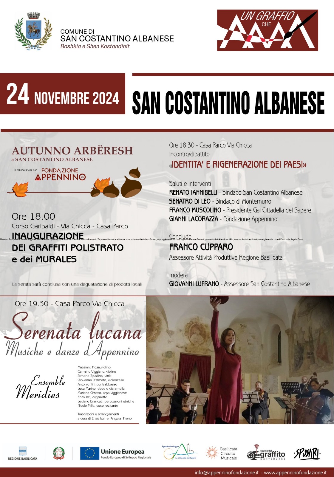 Si conclude il 24 novembre il progetto “Un Graffio che AMA”, il progetto che il Comune di San Costantino Albanese sta realizzando in collaborazione con Fondazione Appennino e che ha l’obiettivo di valorizzare la cultura e l’identità locale, caratterizzata tanto dalla tradizione e storia arbereshe quanto dalla presenza del Parco del Pollino, attraverso percorsi di rigenerazione urbana.