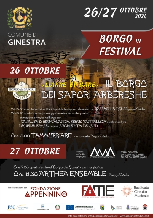 L’evento del 26 ottobre è Borgo dei Sapori arbëreshë, LIAKRE ET BARE, con musica tra i vicoli del centro storico e stand enogastronomici per celebrare le contaminazioni culturali ed enogastronomiche della comunità di Ginestra.