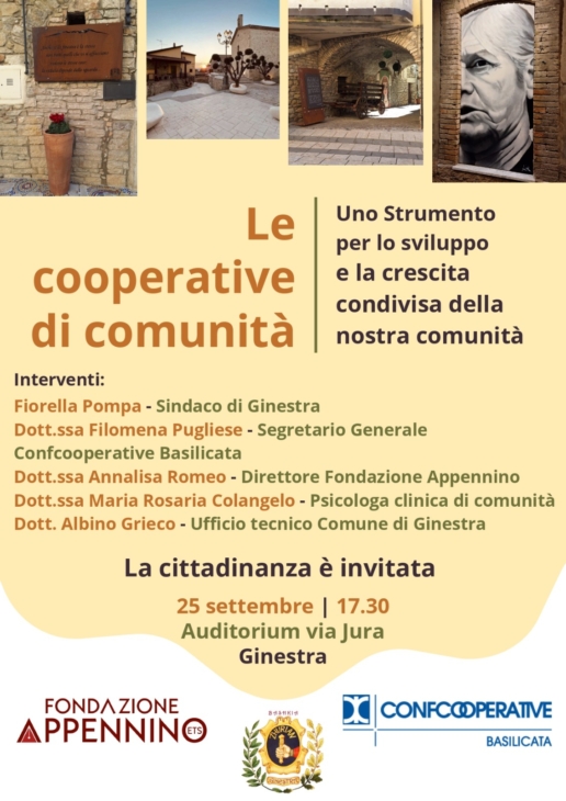 L’evento, promosso da Confcooperative Basilicata e dal Comune di Ginestra in collaborazione con Fondazione Appennino, rappresenta un momento di confronto e riflessione sul ruolo delle cooperative di comunità come modello di partecipazione, innovazione sociale e valorizzazione dei territori interni.