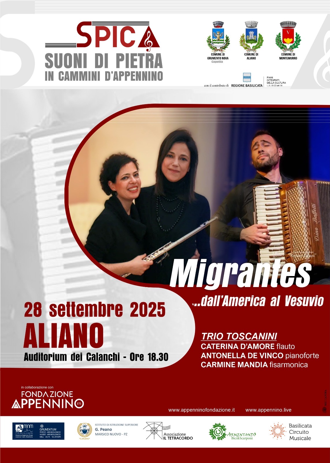 Il progetto, finanziato dai Piani Integrati della Cultura della Regione Basilicata ad una partnership di comuni costituita da Grumento Nova (capofila responsabile), Montemurro e Aliano, si avvale della collaborazione di Fondazione Appennino ETS, in qualità di ente coordinatore e attuatore, e della partnership del Museo Archeologico dell’Alta Val d’Agri e Parco Archeologico di Grumentum, dell’Istituto di Istruzione Superiore “G.Peano” di Marsico Nuovo, dell’associazione musicale “Il Tetracordo” di Avigliano e dell’associazione “Armentando – bici&scarponi” di Armento.