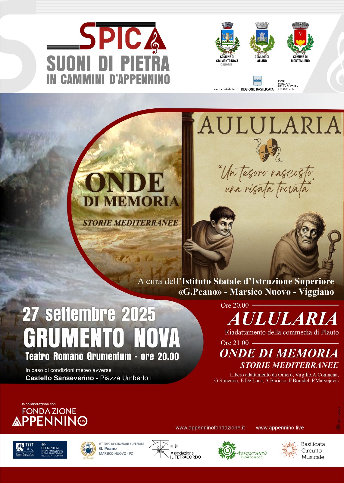 Iniziato alla fine di giugno, il programma ampio ed articolato si avvia alla sua conclusione portando in scena due degli ultimi eventi previsti, dentro una serie di attività realizzate con concerti nei tre comuni partner, distribuiti e organizzati da Basilicata Circuito Musicale in collaborazione con “Il Tetracordo”, una summer school a Montemurro destinata a giovani artisti e musicisti suddivisa in laboratori con masterclass musicali e ore di formazione su event management, marketing e comunicazione. Dopo la chiusura della summer school, avvenuta a Montemurro lo scorso 13 settembre, che ha visto realizzare 4 laboratori con masterclass, cammini, performance degli allievi e concerti di artisti affermati a Montemurro, Armento, Grumento Nova e Aliano, il prossimo week end parte con il protagonismo dell’Istituto Statale di Istruzione Superiore “G.Peano” di Marsico Nuovo e Viggiano, che porta in scena “Aulularia”: riadattamento della celebre commedia di Plauto, e “Onde di Memoria. Storie mediterranee”, un libero adattamento di testi di Omero, Virgilio, A. Comnena, G. Simenon, E. De Luca, A. Baricco, F. Braudel, P. Matvejević, L’appuntamento è a partire dalle ore 20 del 27 settembre 2025 al Teatro Romano nel Parco Archeologico di Grumentum (in caso di maltempo presso il Castello Sanseverino, Piazza Umberto I).