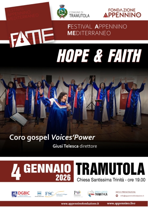 Il 4 gennaio 2025 ore 19.00 nella Chiesa Santissima Trinità a Tramutola il coro gospel Voices’ Power diretto da Giusy Telesca in “Hope & Faith” Gospel Tour.